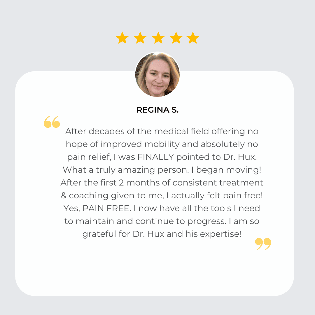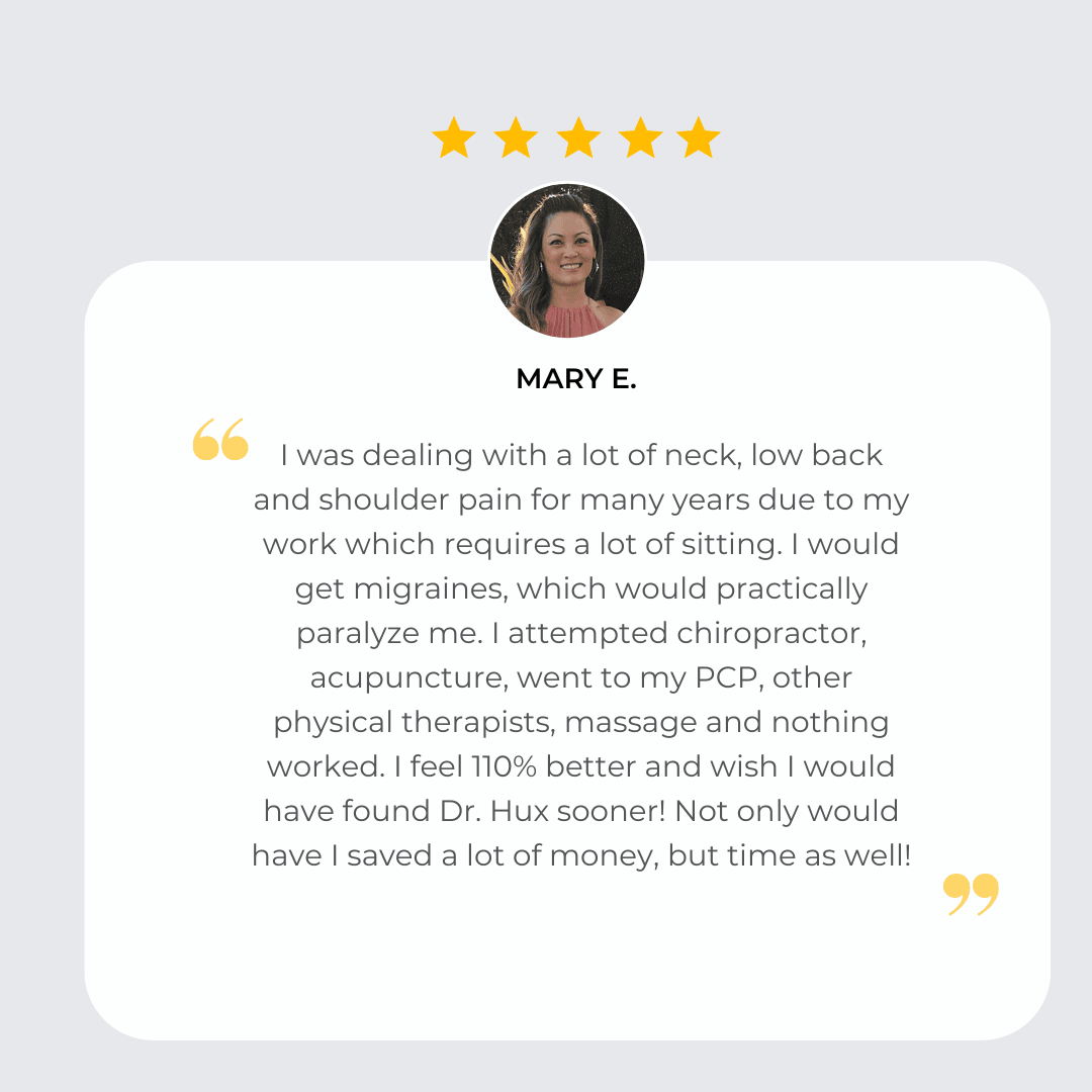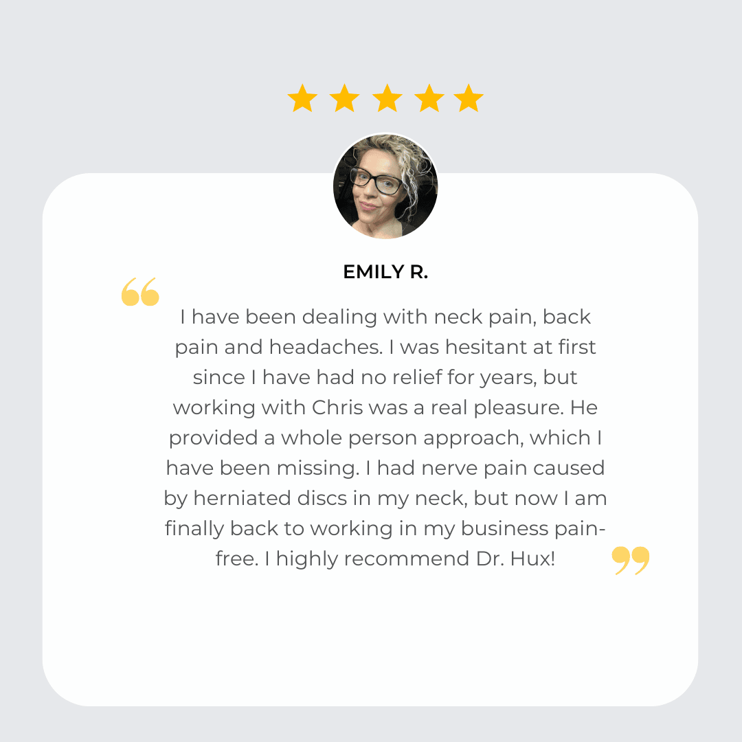 I couldn’t be more pleased with his willingness to help, quick turnaround and attention to detail. I’m now happy to say, I’m 100% pain free and able to enjoy daily activities! I would highly recommend Doctor Christopher Hux!