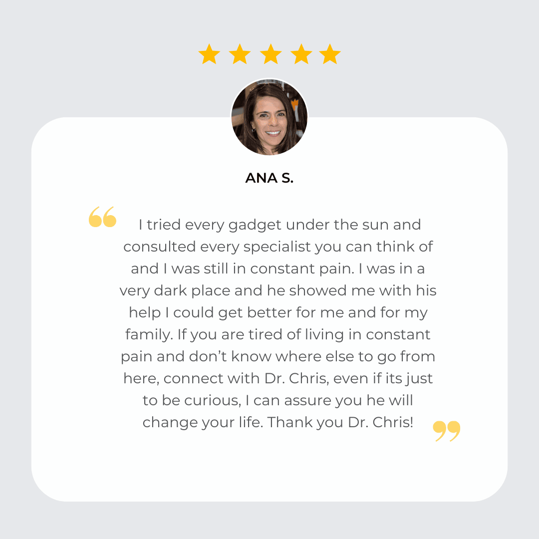 "I reached out to Chris in search of relief of neck and shoulder pain. Initially, I thought the pain would go away on its own but as time went on, the pain got worse. This pain was preventing me from being able to function on a daily basis. Simple tasks such as driving and taking care of my kids were becoming increasingly difficult. I was surprised to feel significant relief after just one session.